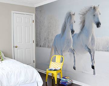 Waarom paarden?De eigenaardigheid van de paarden zit hem in het karakter. Bij het ontwerpen van dit thema was het het doel om de snelheid, spontaniteit en dynamiek vast te leggen, waarmee paarden worden geassocieerd. Ze zijn op hetzelfde moment sterk en zachtaardig. Bovendien staan ze bekend om hun bovengemiddelde intelligentie en dit is wellicht de reden waarom ze zelf ook van het gezelschap van mensen kunnen genieten. Mensen willen op hun beurt juist hun gelijkenis in het interieur hebben. Een beetje leven in je huis is natuurlijk nooit verkeerd en dit intrigerende landschap maakt de ruimte die je wilt vernieuwen volledig onherkenbaar. En wie houdt er niet zo af en toe van wat verandering? Laat de vrijheid losgaan op je muren. Misschien was dit net zo'n soort vonk dat je appartement miste?
